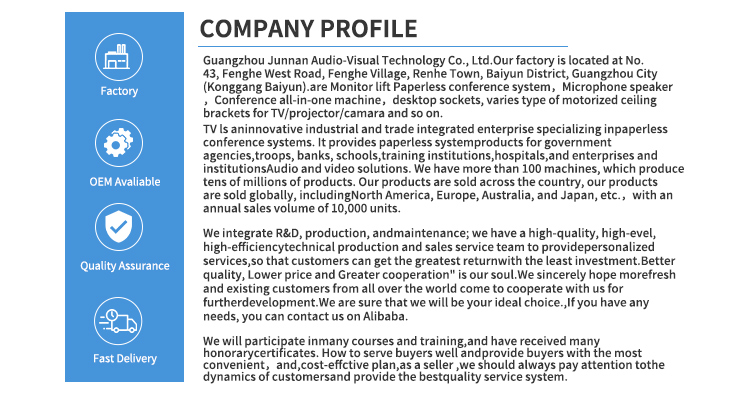 Monitory Advanced Electric OLED Screen LCD Monitor Lifter jsou vhodné pro všechny druhy scén, máme technologii řezání CNC strojů a laserovou technologii, nejnovější technologii konferenčního stolu LCD Screen Lifter, abychom zajistili, že produkt splňuje ultra vysoké standardy. Všechny naše OLED lcd zvedáky patří k Made in China, jsou k dispozici pro velkoobchodní nákup, mohou být soukromě přizpůsobeny pro zákazníky a mají dostatek elektrického zvedáku LCD monitoru s dotykovou obrazovkou na skladě podporují rychlé dodání zákazníkům. A naše zařízení junnan má různé certifikace certifikátů, jako je CCC, CE certifikát, ROHS, certifikace ISO, produkt je bezpečný a vysoce kvalitní, s exportní kvalifikací, je přímou továrnou s příznivou cenou, má vlastní továrnu a funguje již mnoho let.
